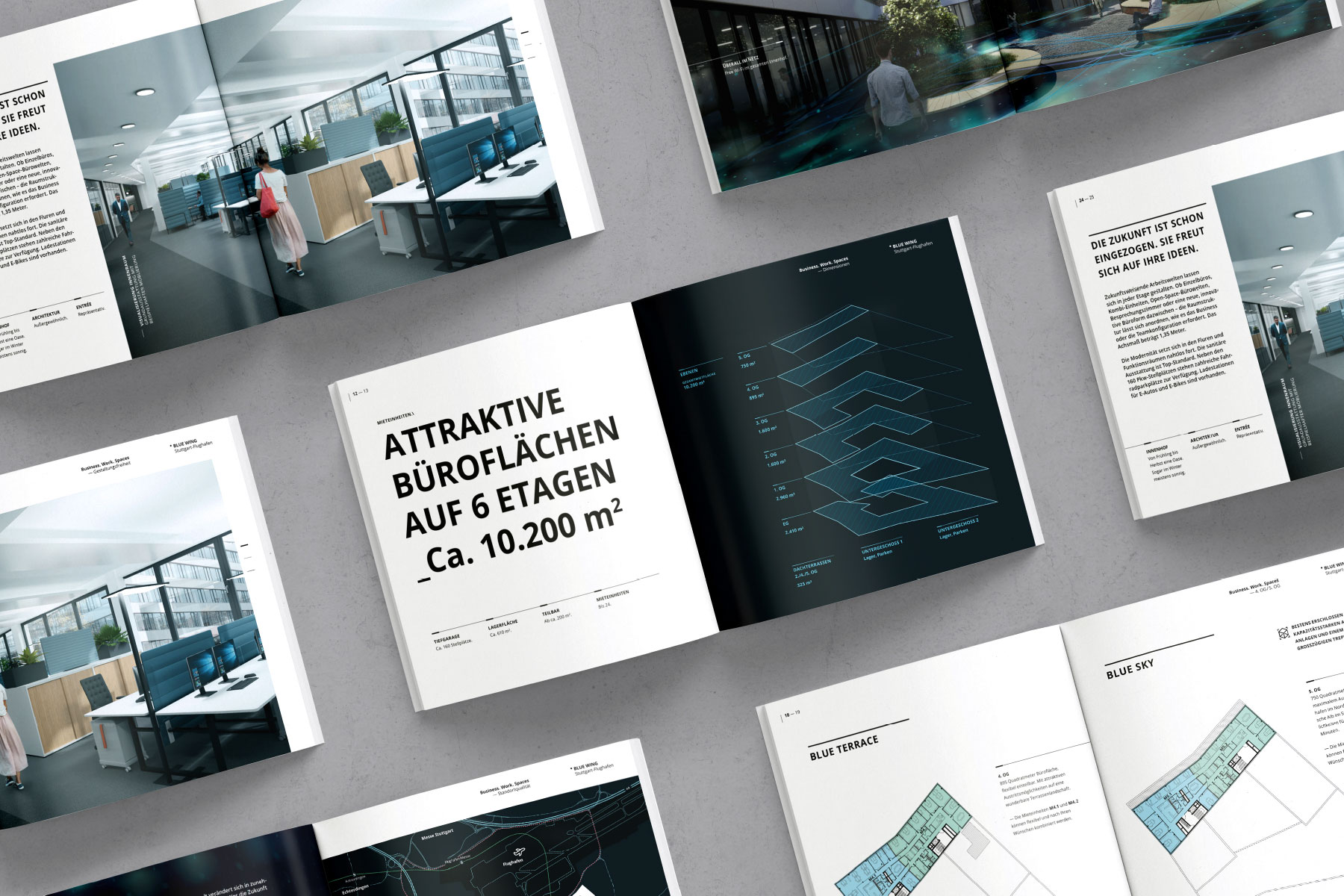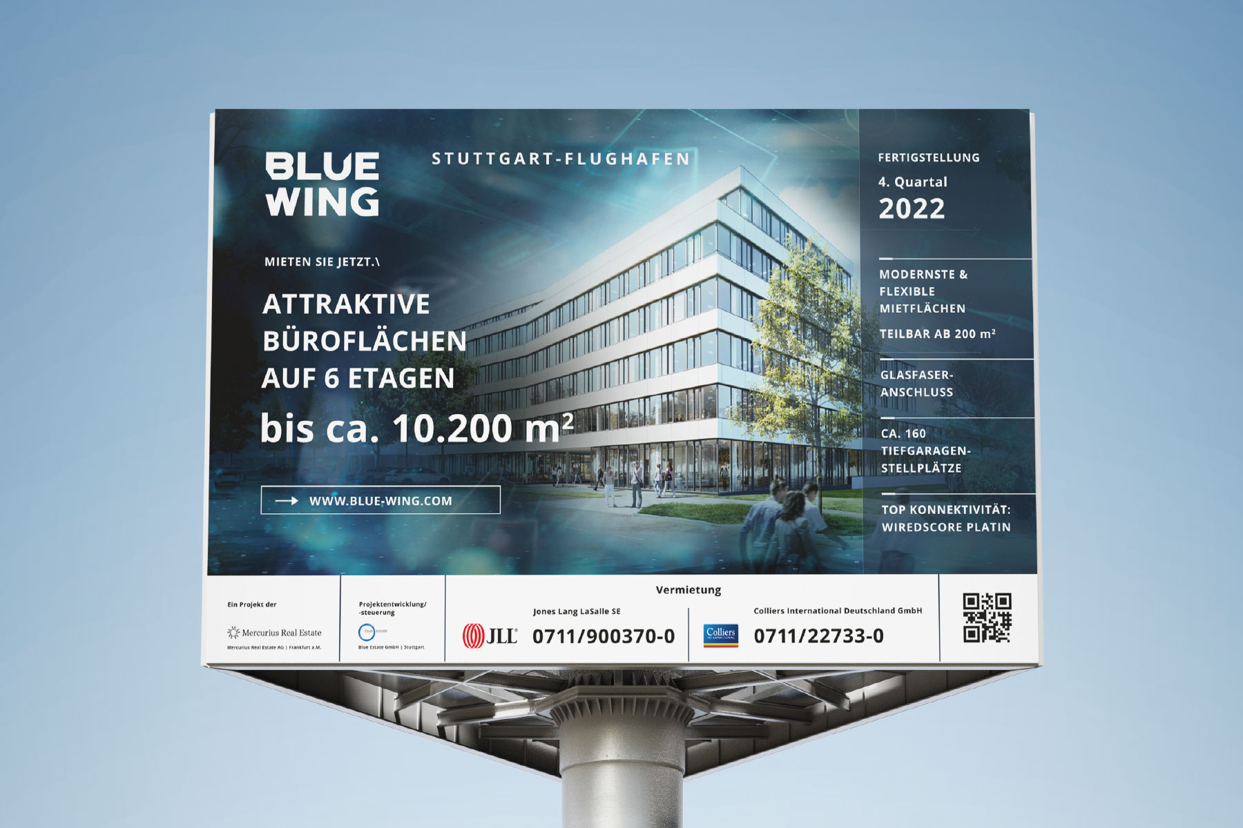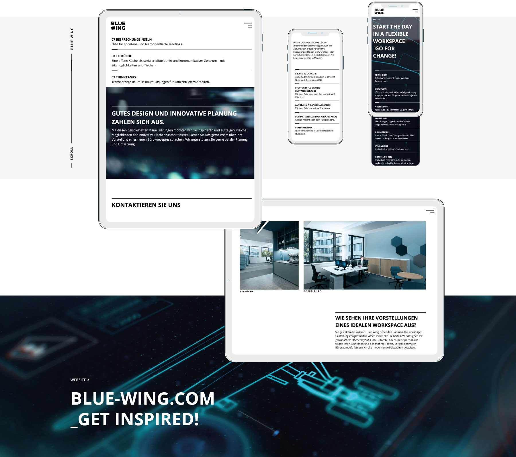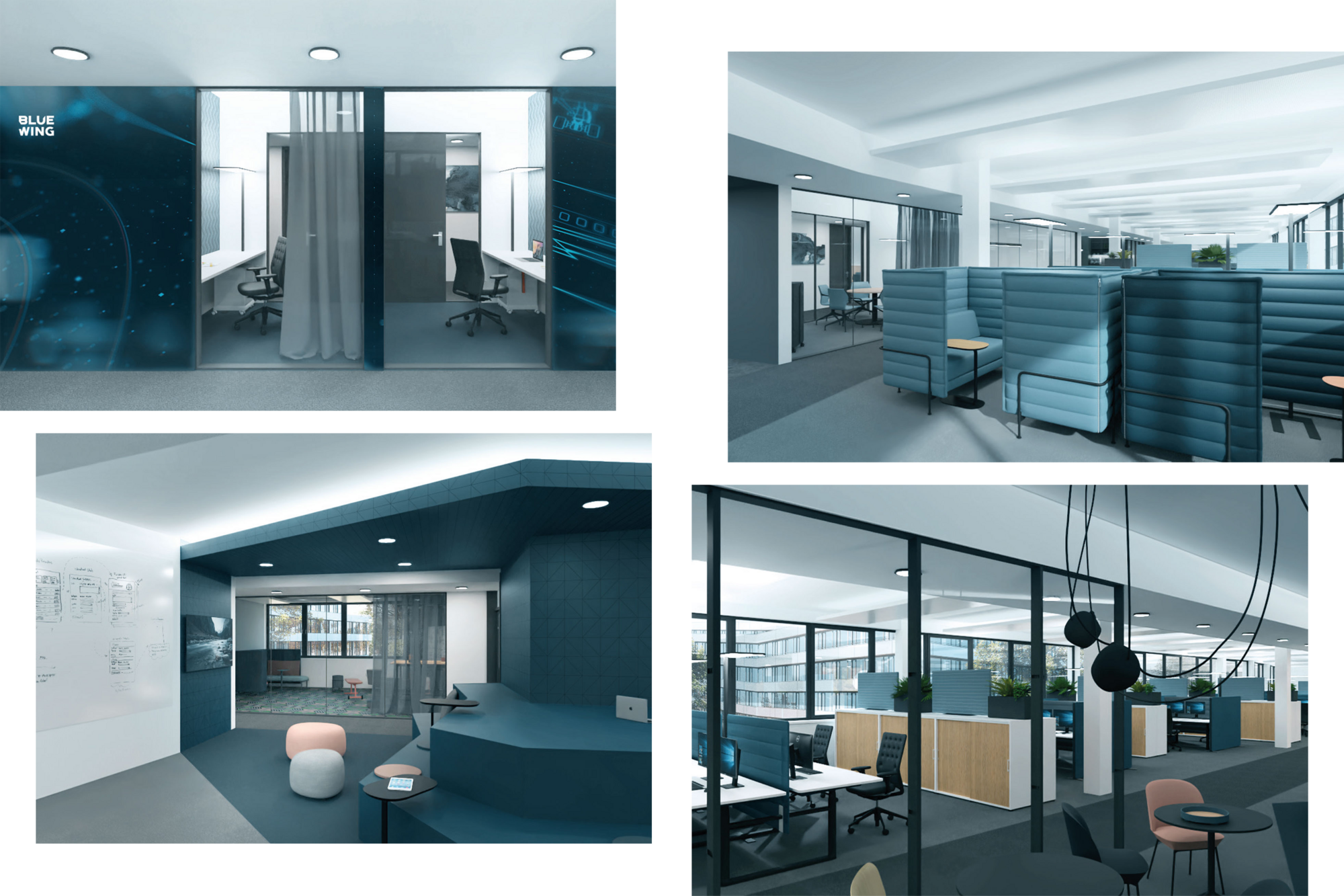 Die digitale Transformation ist in vollem Gange. Sie verlangt nach flexiblen Konzepten – im Kopf, im Raum, im Büro. Für Blue Wing wurde sowohl ein neues Branding entworfen als auch exemplarische Innenraumkonzepte, vom Open Space bis hin zu Think Tanks. Das Thema „New Work“, „Digitalisierung“, „Blue“ und v.a. auch der Standort am Flughafen bzw. die Lichter des Flughafens stehen als gestalterische Parameter im Vordergrund.
