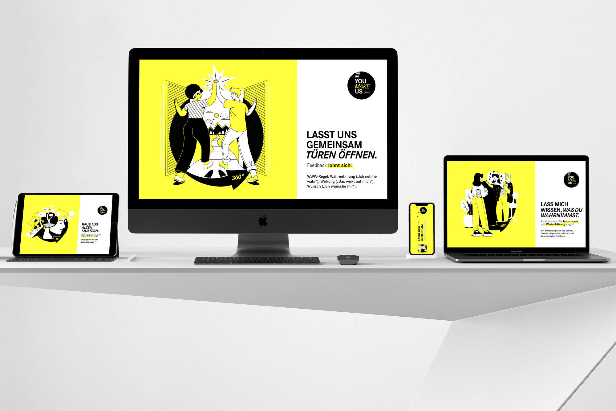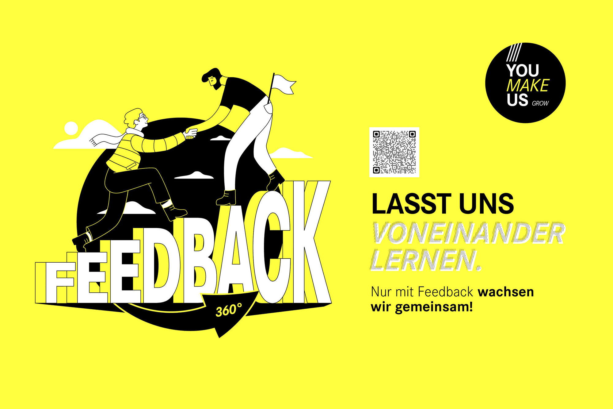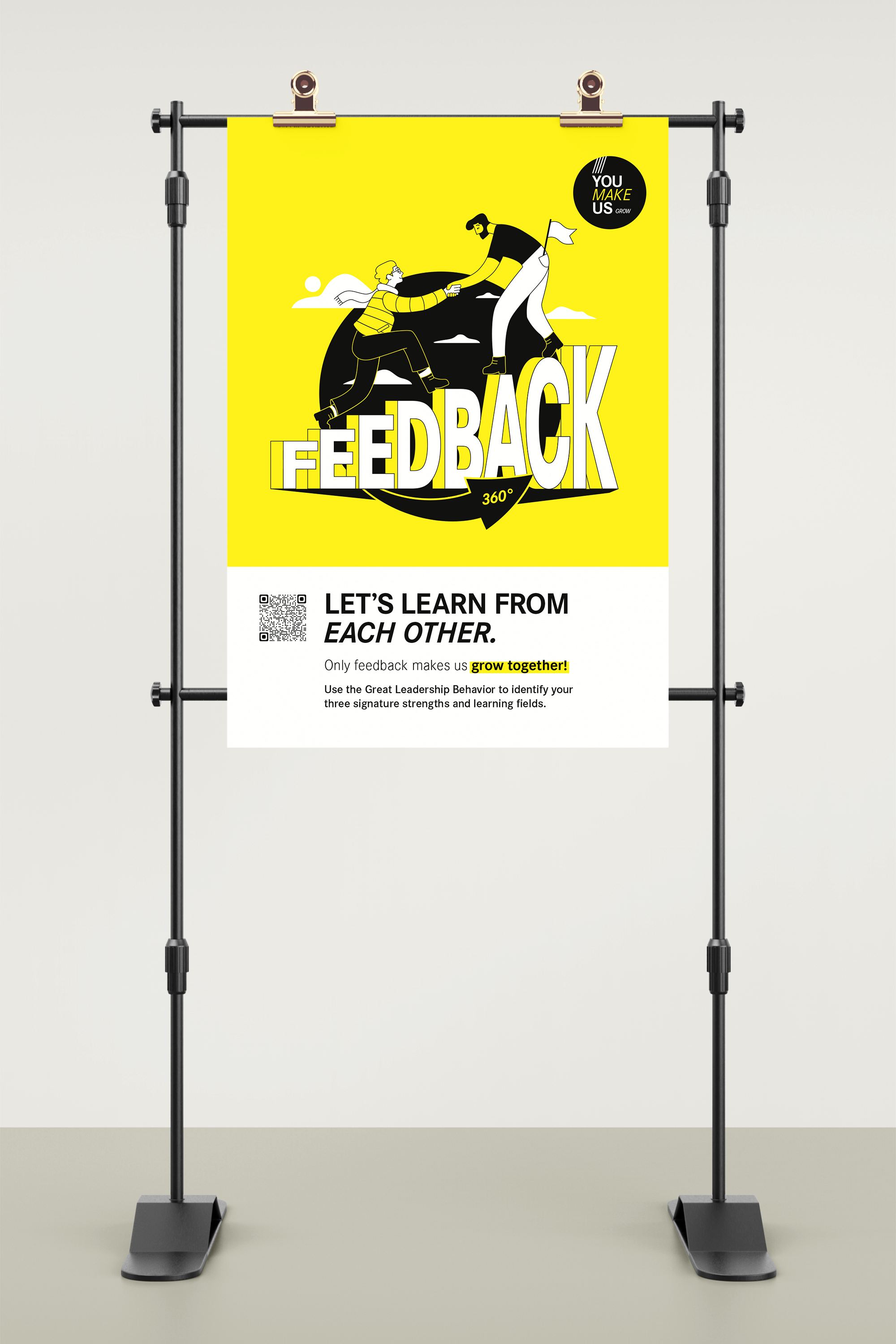 Für eine positive Feedback-Kultur wurden Regeln in einem aufwendigen, internen Prozess erarbeitet. Wir haben die grafische Umsetzung übernommen und Illustrationen konzipiert und umgesetzt. Die Anwendung erfolgte in Layouts von Postern, digitalen Anzeigetafeln, E-Mail Bannern, Sperrbildschirmen, Teamshintergründen und Elementen für's Social Intranet.
