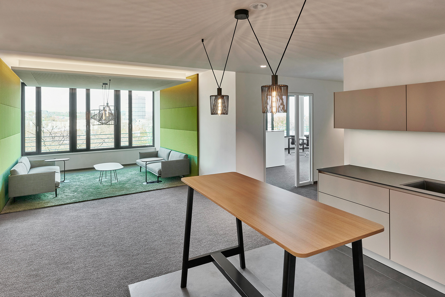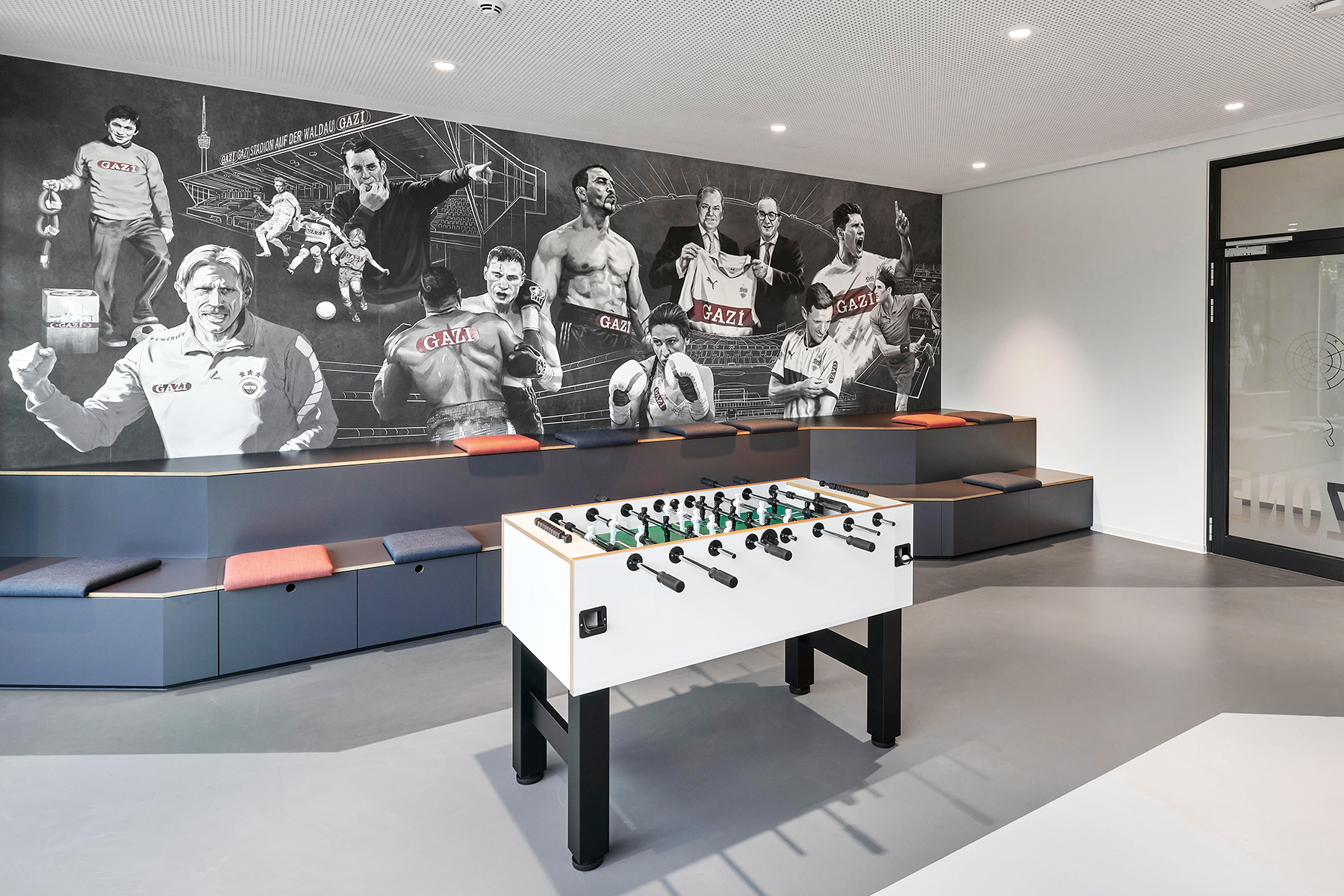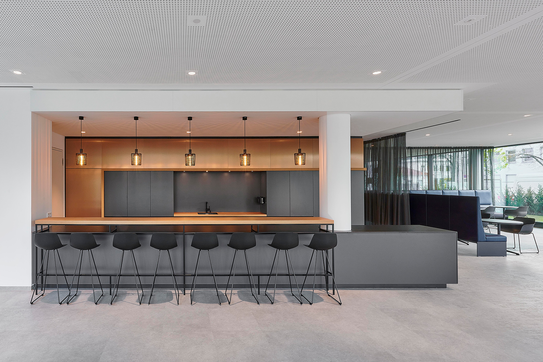 Der Neubau, der unmittelbar an die Bestandsimmobilie angrenzt, besteht aus einem Bürogebäude und einem hochmodernen Kühllager. Die Büroflächen bieten dem Nutzer flexible Arbeitswelten, die aus unterschiedlichen Büroformen bestehen. Diese werden durch individuell gestaltete Rückzugsmöglichkeiten abgerundet. Im Erdgeschoss ist ein großzügiger Bereich für die Mitarbeiter entstanden. Neben der Kantine, gibt es eine Showküche und eine Game-Zone. Die Mitarbeiter sollen sich hier wohlfühlen und der Anspruch der Marke soll deutlich kommuniziert werden. Dies gilt natürlich auch für alle anderen Orte im Gebäude.