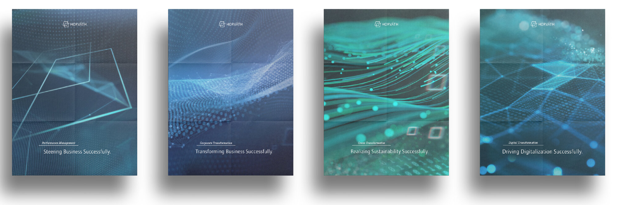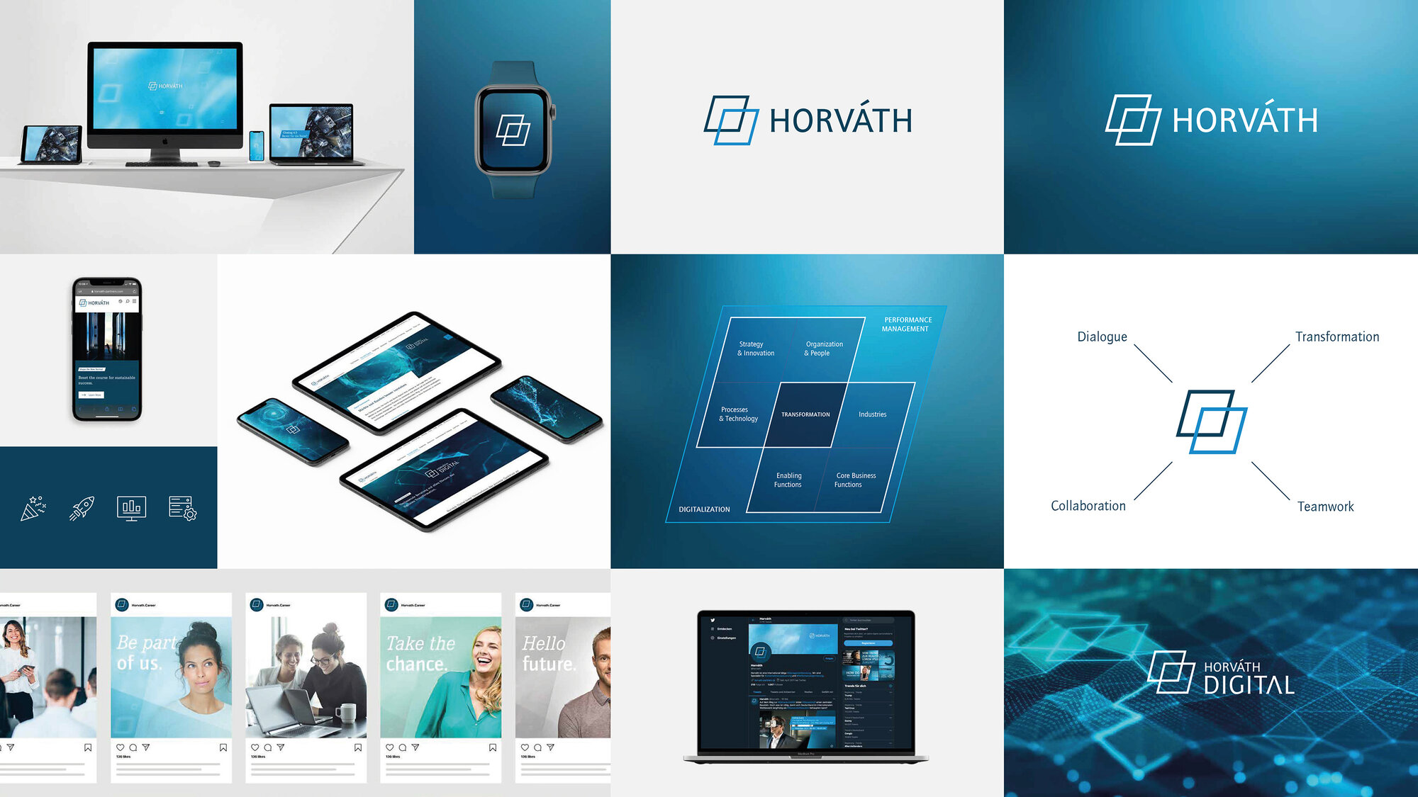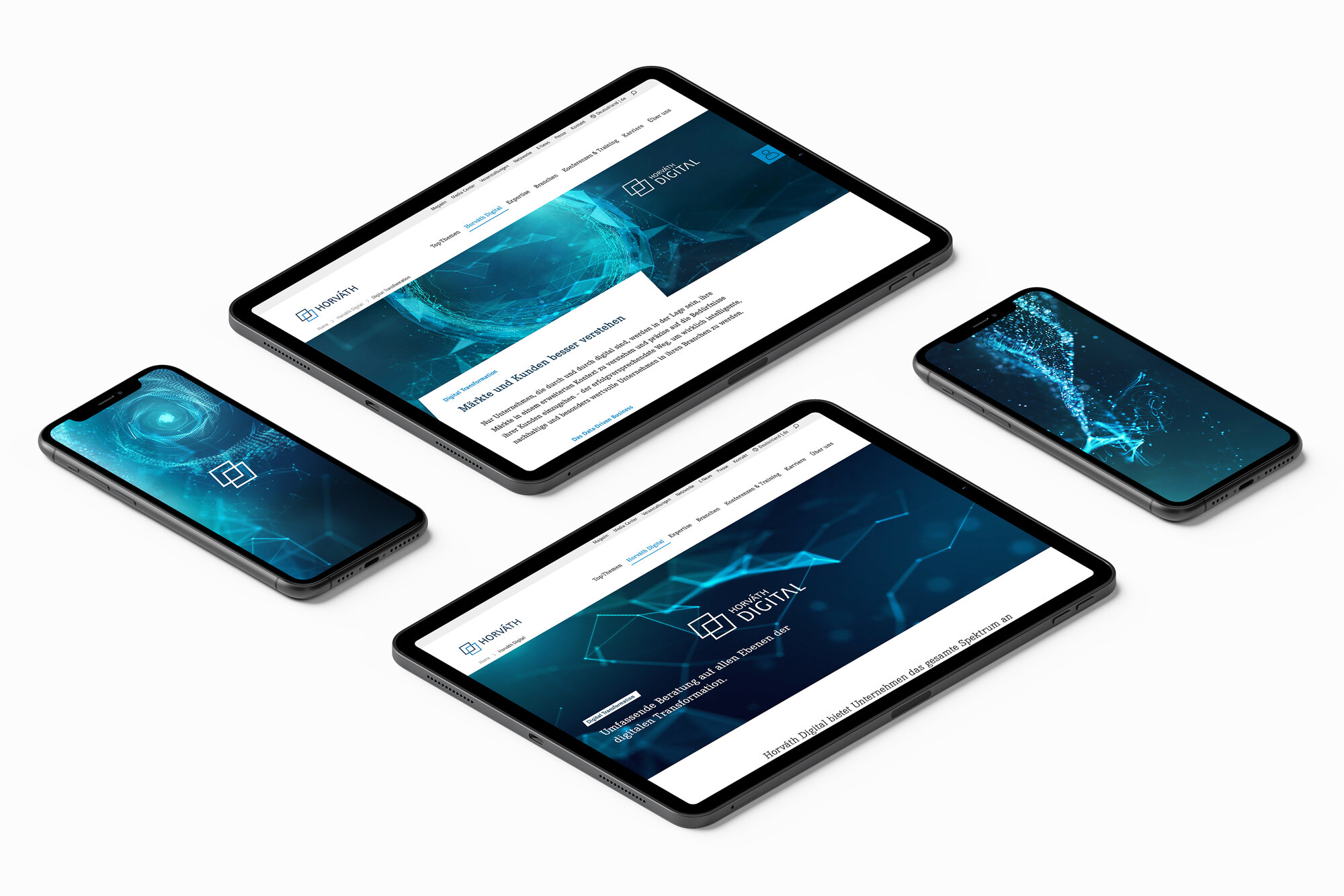 Für Horváth haben wir einen strategischen Markenrelaunch rund um das Thema Transformation vorgenommen und bieten nun seit 2020 eine 360-Grad-Betreuung. Bei der Gestaltung der Digital Brand haben wir ein modulares Design-System zugrunde gelegt, das durch den konsistenten Einsatz der Markenelemente stets eine hohe Wiedererkennbarkeit ermöglicht. Wir setzen nicht nur zahlreiche analoge und digitale Projekte sowie Animationen um, sondern auch die Signaletik bzw. Marke im Raum einiger Neubauten der Horváth Offices.