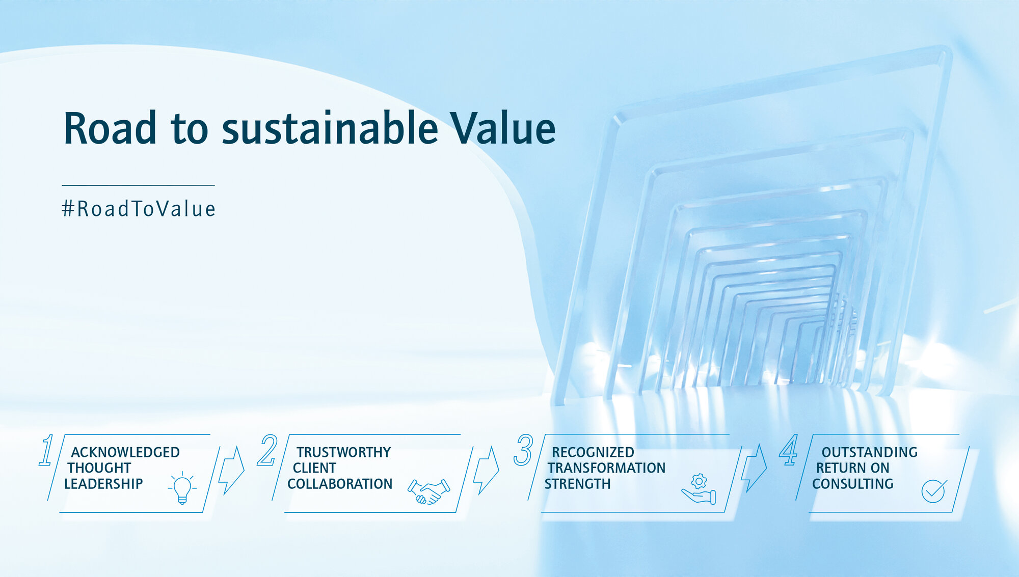 In einem von uns begleiteten Markenprozess entstand die neue Value Proposition „Road to sustainable Value“. Diese verläuft entlang der vier Milestones und basiert auf den Kernkompetenzen Transformation, Performance Management und Digitalisierung. Sie baut strategisch zudem auf der Vision, Mission und dem Purpose der global agierenden Consulting Company auf. Die anschließende Visualisierung umfasste verschiedene Keyvisuals sowie einen Einführungsfilm mit den vier Horvàth Vorständen als Testimonials.