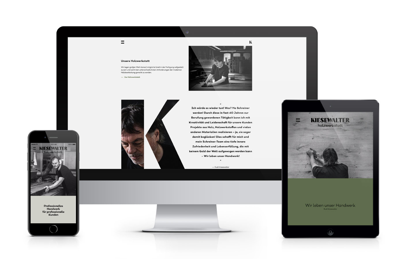 Traditionelles Handwerk trifft Leidenschaft. Die holzwerkstatt kiesewalter lebt das Handwerk. Die Begeisterung zum individuellen und kreativen Gestalten mit Holz ist ihre Leidenschaft. Wir hatten das Vergnügen, diese Individualität und Leidenschaft in den Fokus zu rücken und der holzwerkstatt kiesewalter einen neuen Look zu verschaffen. Dies beinhaltete unter anderem Branding, Website, Geschäftsausstattung und zahlreiche weitere Kommunikationsmaßnahmen.