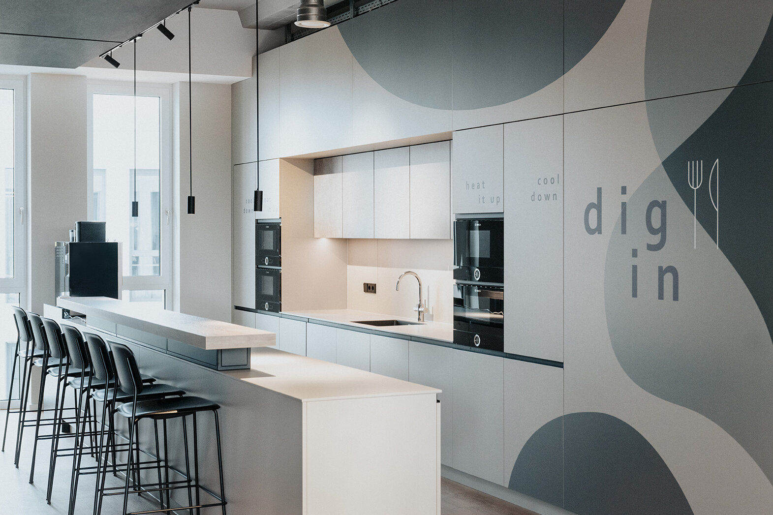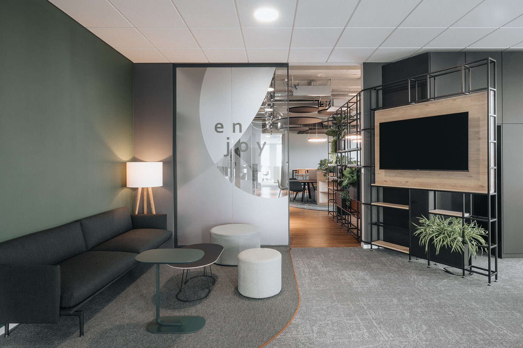 Die Innenarchitektur für das Pharmaunternehmen kombiniert geschickt Elemente des Industrial Designs mit einer grünen Note durch die Integration von Pflanzen. Der offene Arbeitsbereich schafft eine kollaborative Atmosphäre, die die Kreativität und Produktivität der Mitarbeitenden fördert. Die Verwendung von industriellen Materialien wie Stahl und Beton verleiht dem Raum ein modernes und professionelles Gesicht, während Pflanzen und organische Formen eine beruhigende und natürliche Umgebung schaffen.