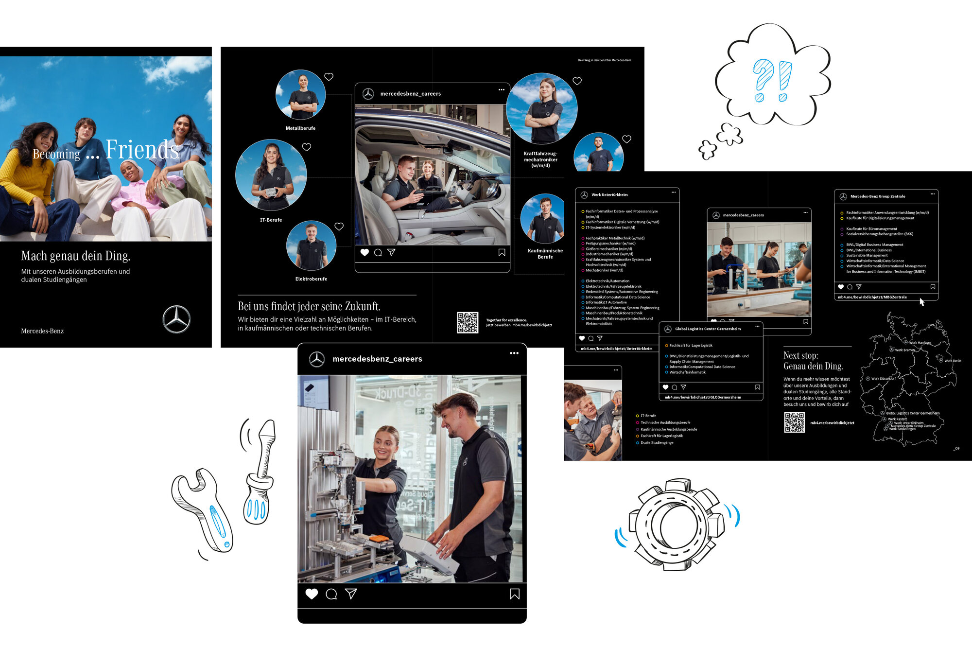 Gestaltung des Azubi-Auftritts für Mercedes-Benz mit Illustrationen, einer neuen Bildwelt und verschiedenen Kommunikationsmaßnahmen. Die Umsetzung erfolgte unterhalb der aktuellen Employer Branding Kampagne.