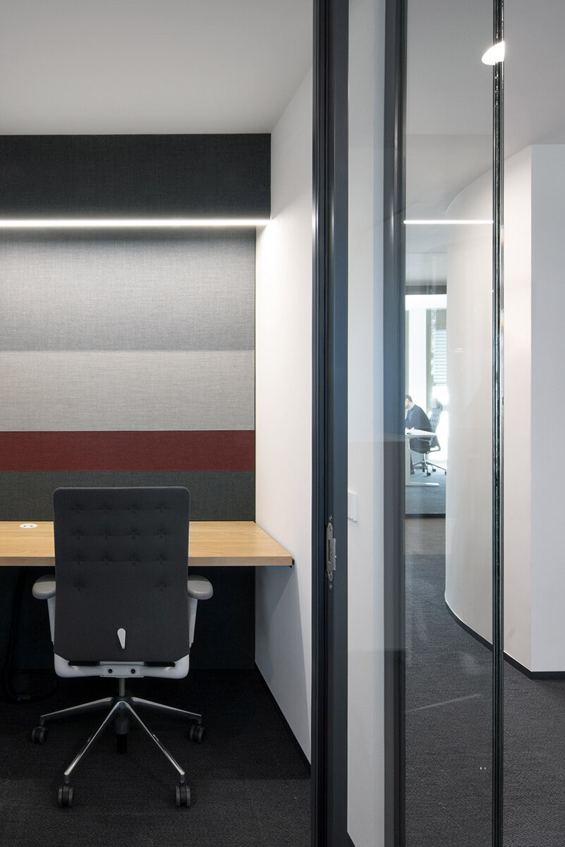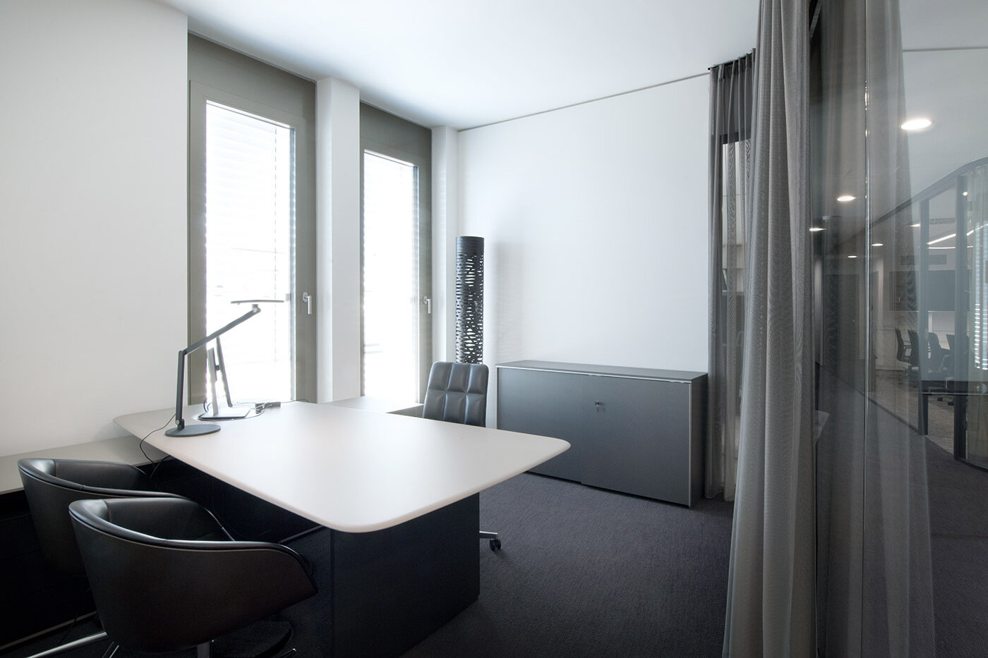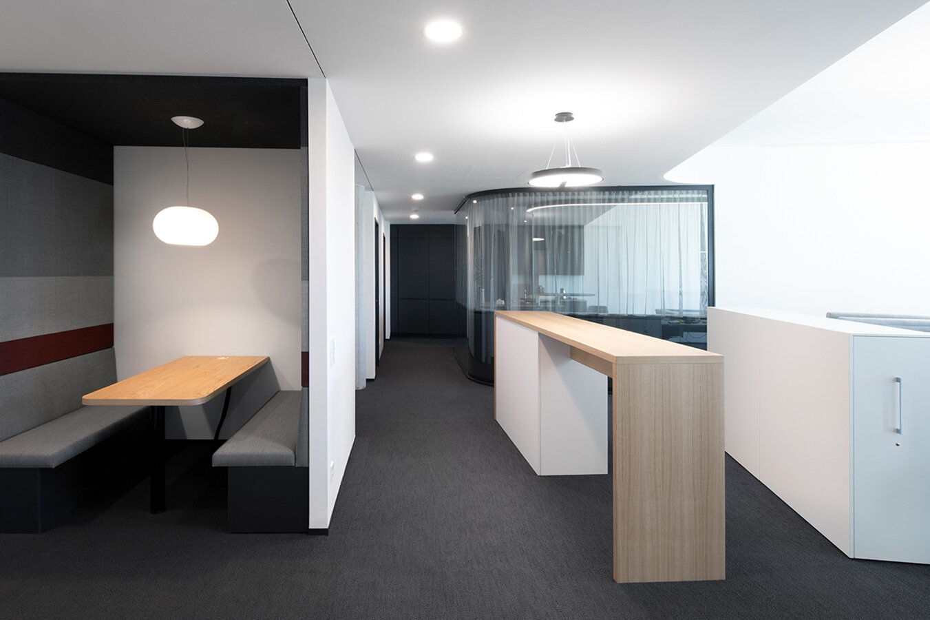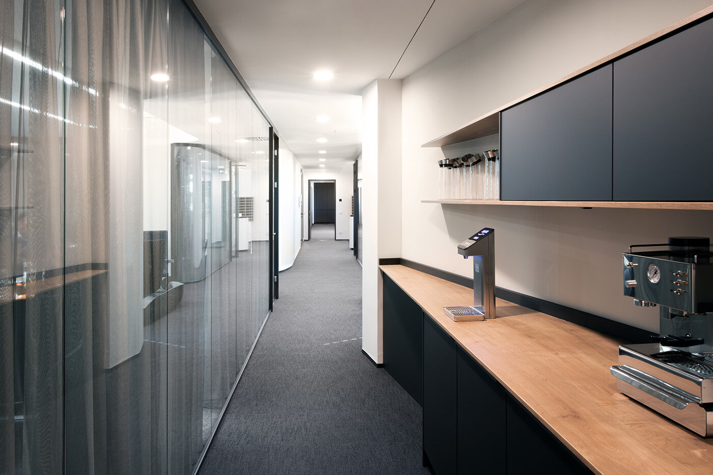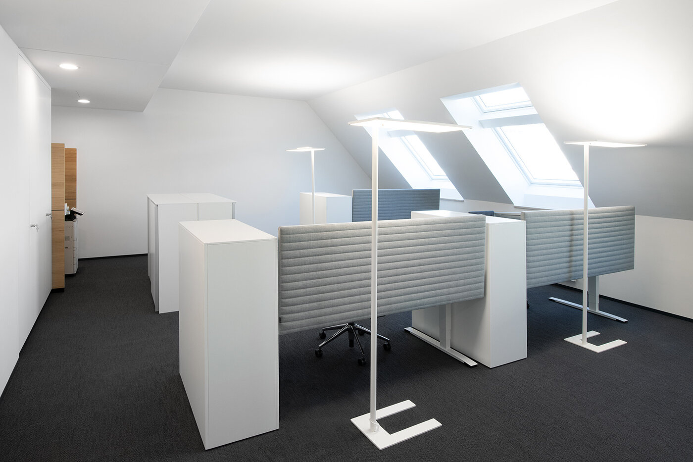Stilvoll über den Dächern der Stadt – so lässt sich vortrefflich das neue Domizil von thi investments beschreiben. Der Dachgeschossausbau weist alle Formen einer modernen und anspruchsvollen Bürogestaltung auf. Arbeitsplätze im Open Space, mit individuell gestalteten Rückzugsmöglichkeiten, zonieren ebenso die Fläche wie die hochwertig ausgestatteten Einzelbüros und Besprechungsräume.