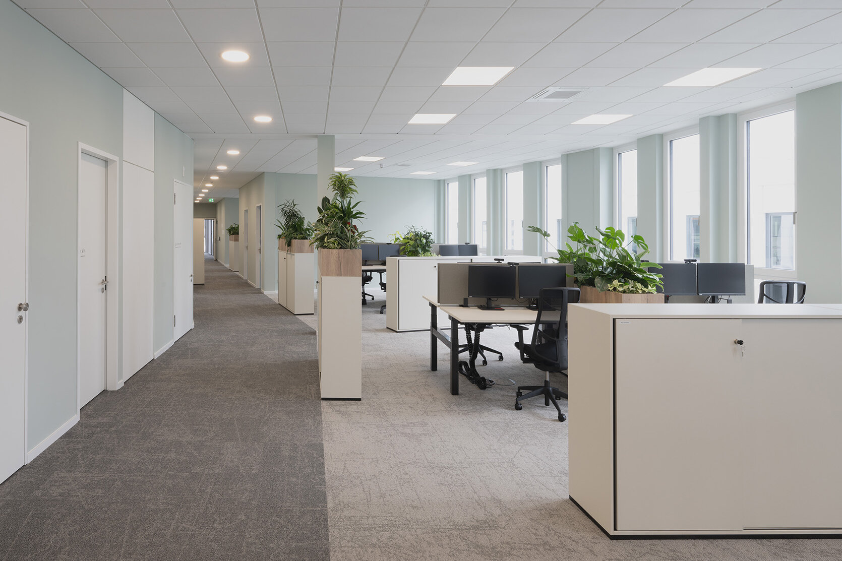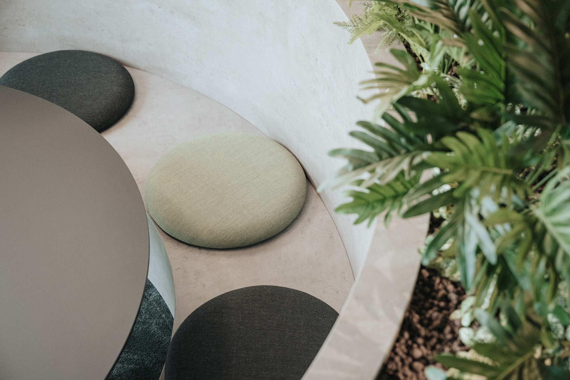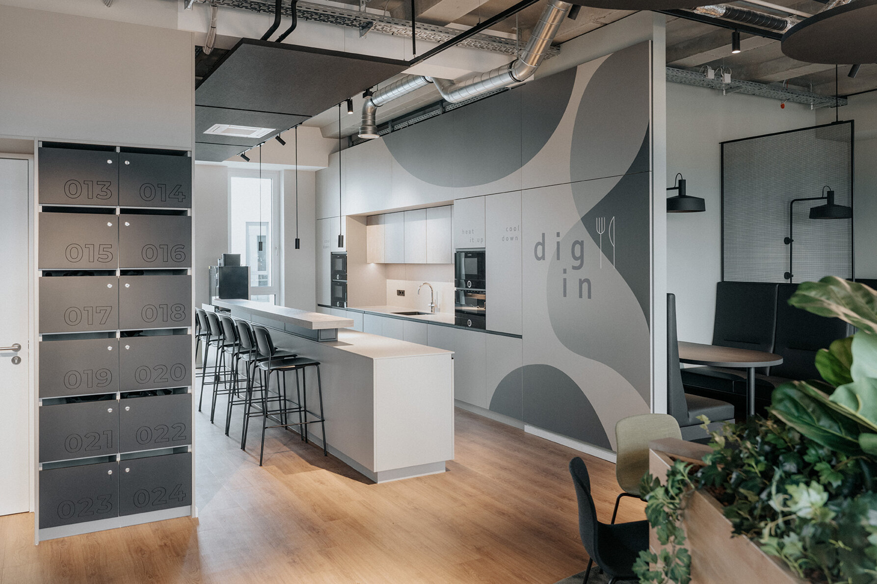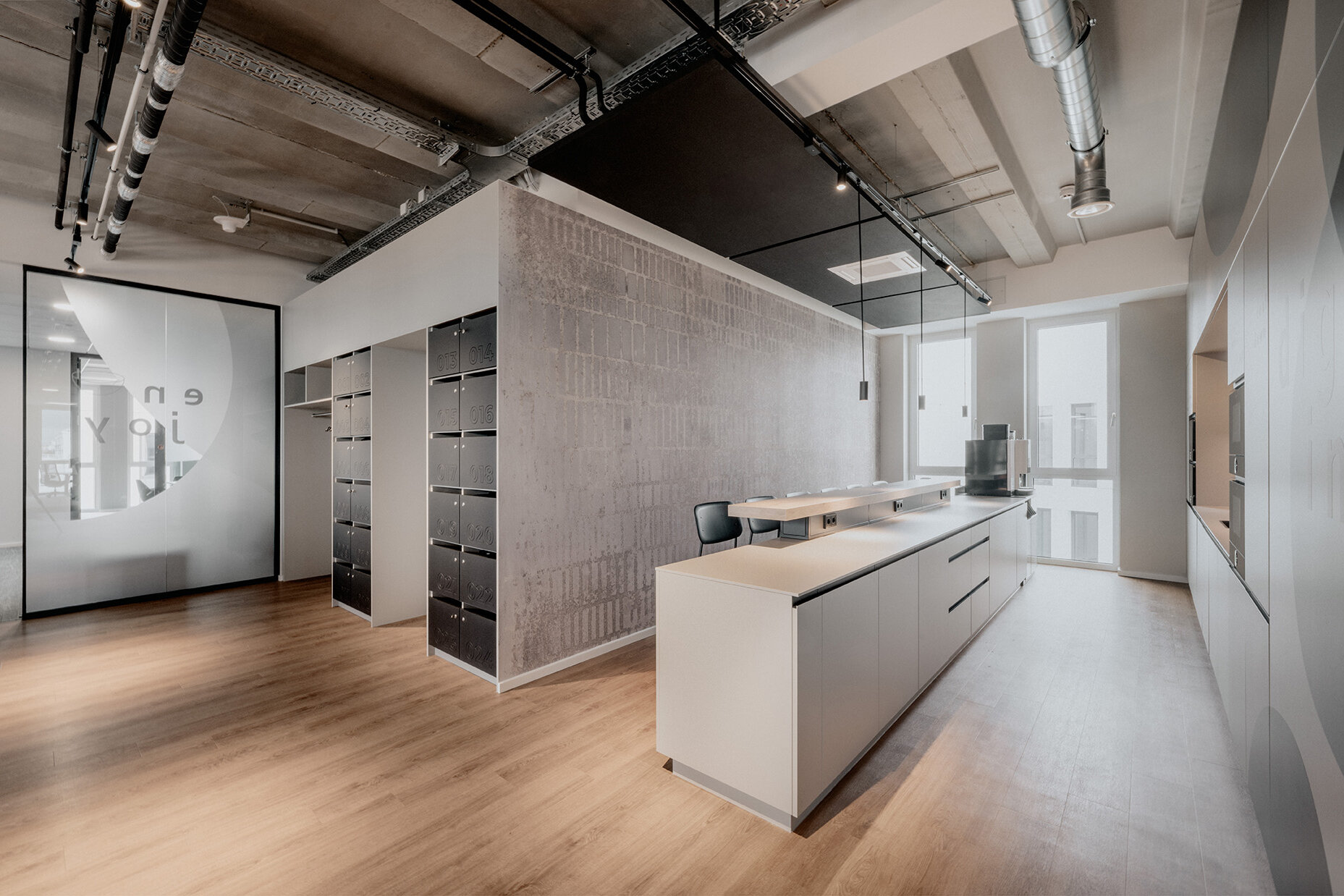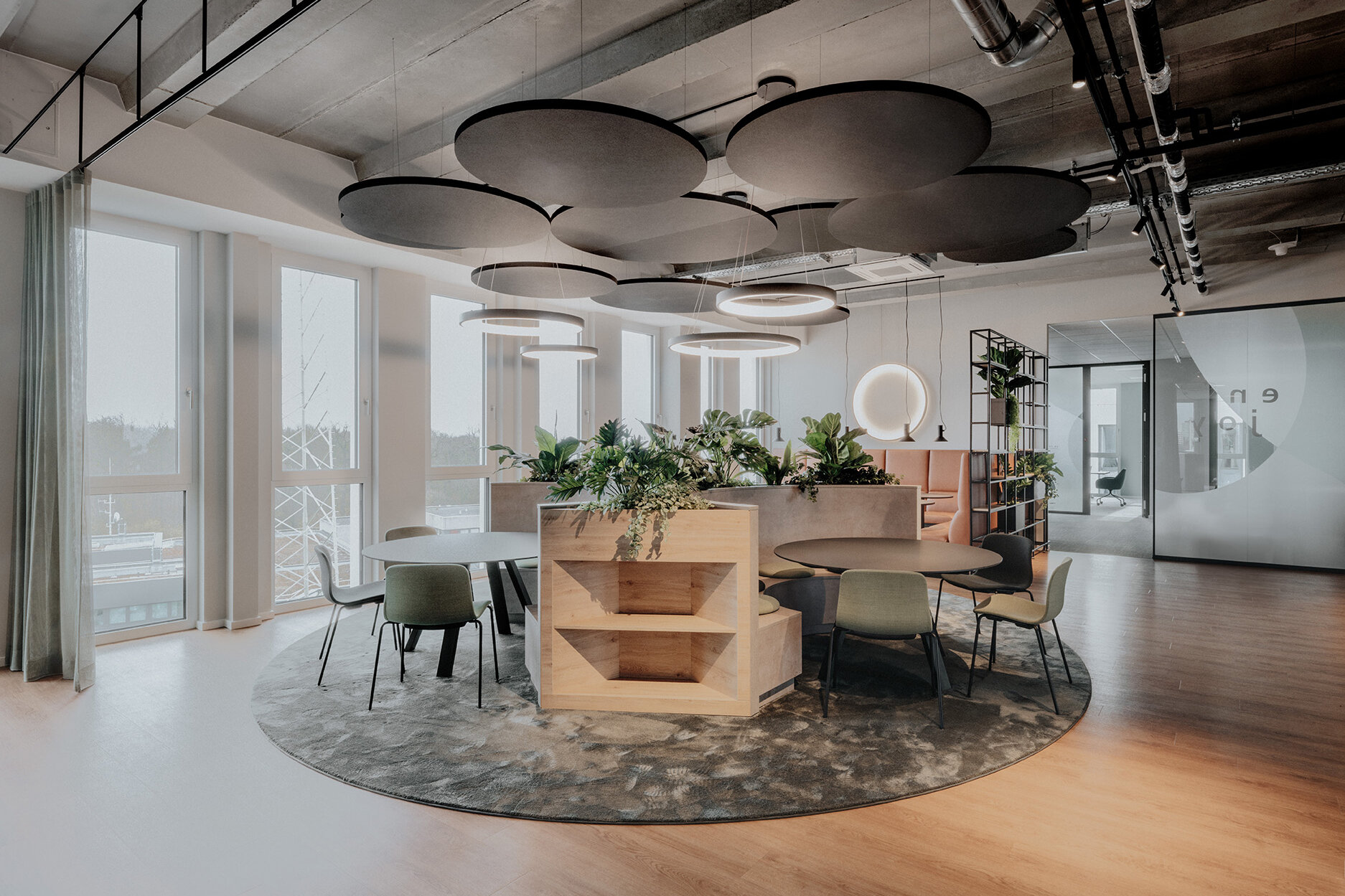 Die Innenarchitektur für das Pharmaunternehmen kombiniert geschickt Elemente des Industrial Designs mit einer grünen Note durch die Integration von Pflanzen. Der offene Arbeitsbereich schafft eine kollaborative Atmosphäre, die die Kreativität und Produktivität der Mitarbeitenden fördert. Die Verwendung von industriellen Materialien wie Stahl und Beton verleiht dem Raum ein modernes und professionelles Gesicht, während Pflanzen und organische Formen eine beruhigende und natürliche Umgebung schaffen.