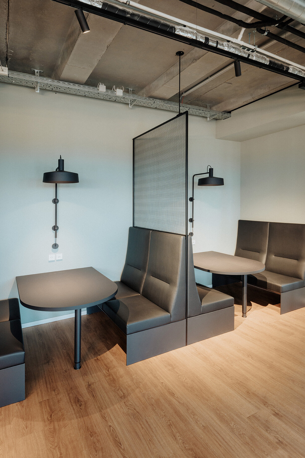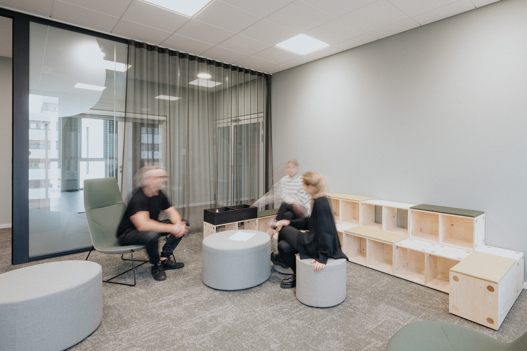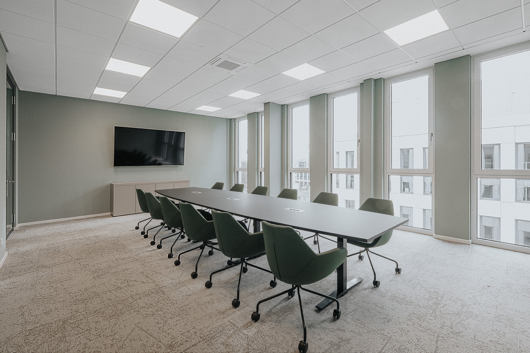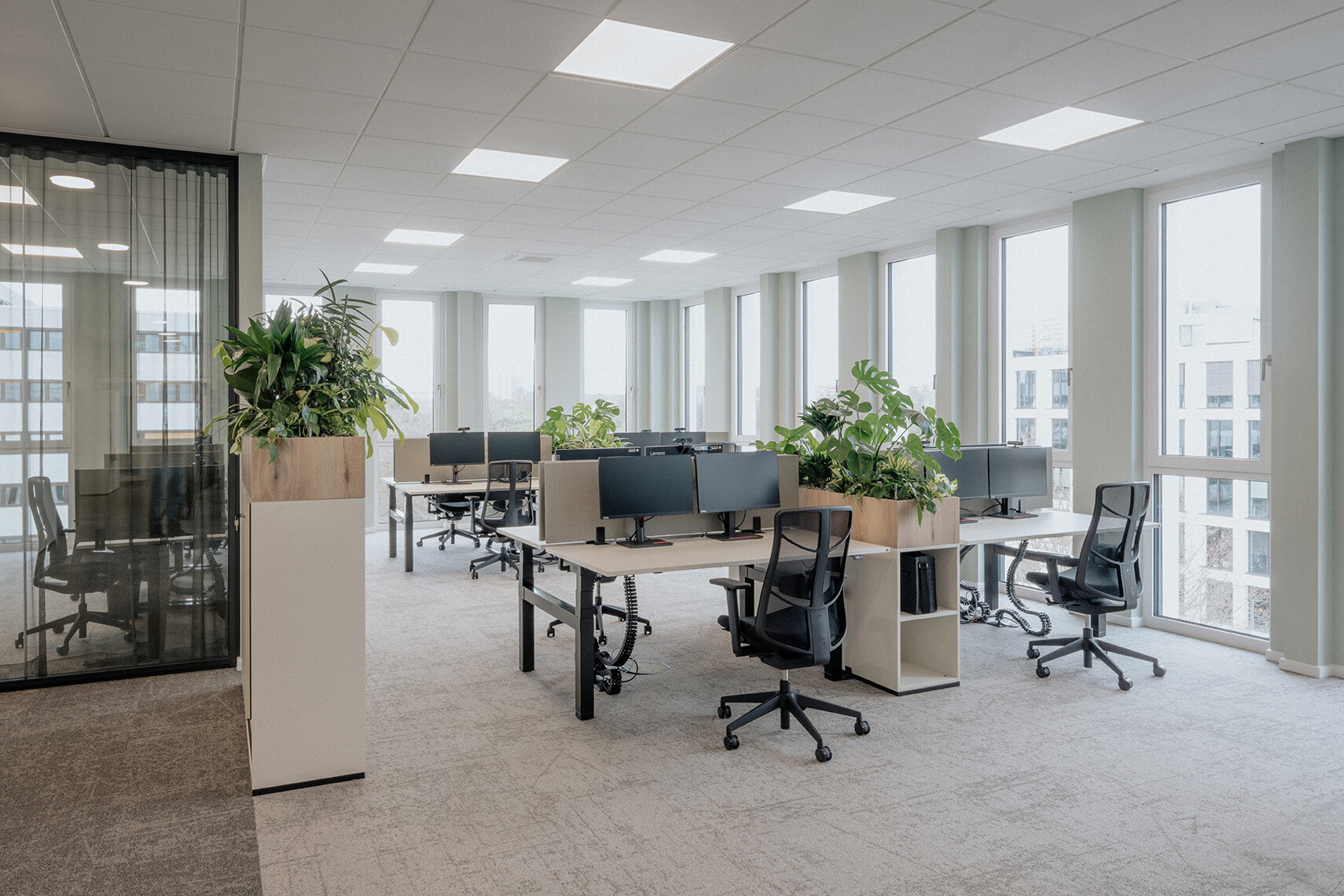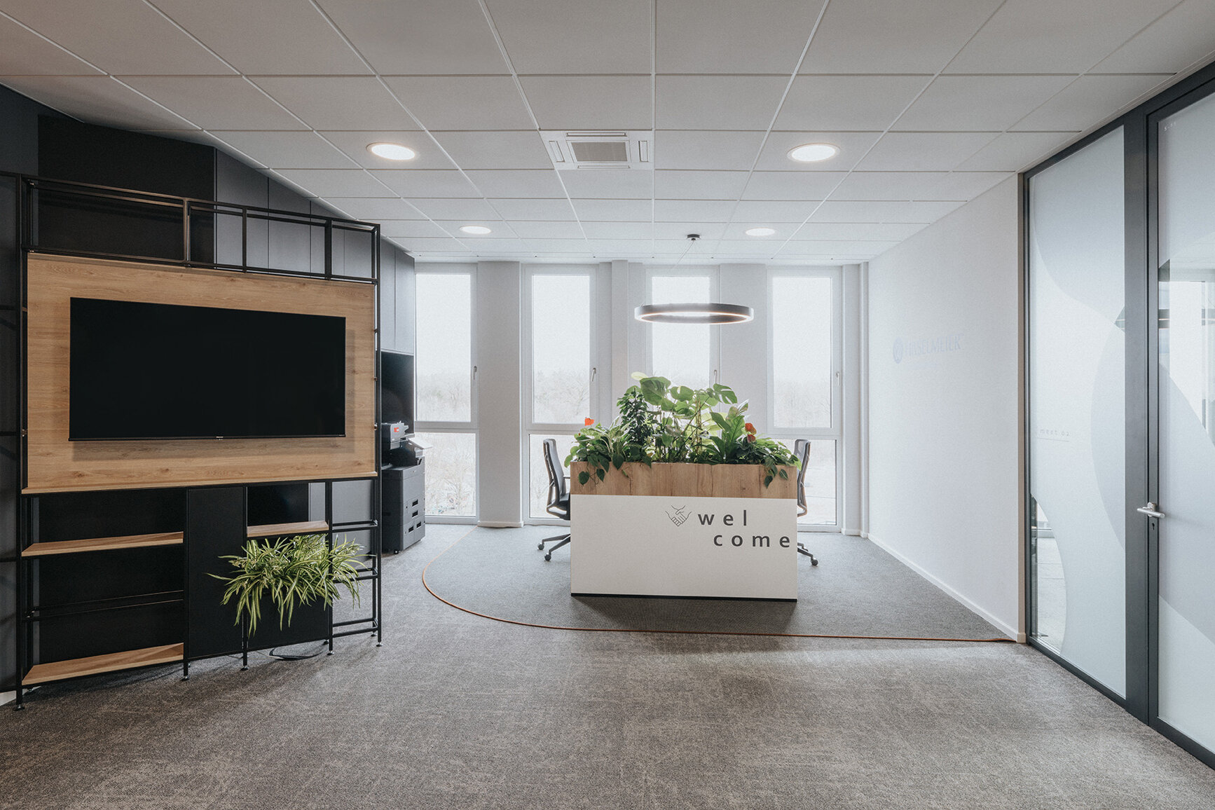 Die Innenarchitektur für das Pharmaunternehmen kombiniert geschickt Elemente des Industrial Designs mit einer grünen Note durch die Integration von Pflanzen. Der offene Arbeitsbereich schafft eine kollaborative Atmosphäre, die die Kreativität und Produktivität der Mitarbeitenden fördert. Die Verwendung von industriellen Materialien wie Stahl und Beton verleiht dem Raum ein modernes und professionelles Gesicht, während Pflanzen und organische Formen eine beruhigende und natürliche Umgebung schaffen.